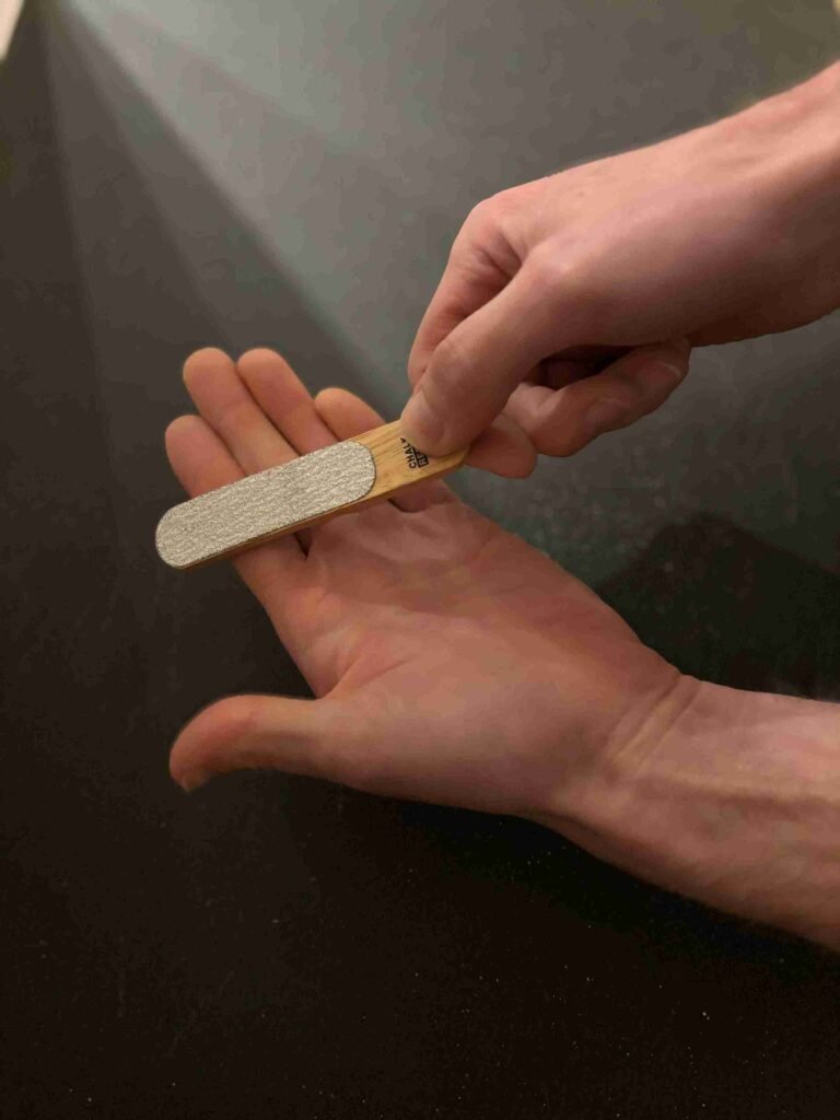 Filing down damaged skin helps keep it smooth and flexible, reducing the risk of cracks and flappers. Keeping your skin even minimizes the chances of rough edges catching on holds and tearing. However, be careful not to make your skin too thin. Use fine sandpaper or a climbing-specific skin file to maintain balance. Filing off dead skin around healing wounds can also help new skin form more effectively.